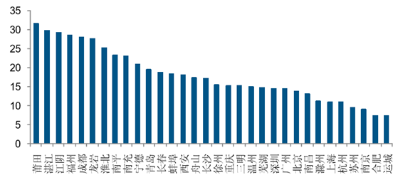 上半年較高的銷量增速帶動庫存實現了一定的好轉,從二季度起庫存絕對量由增入減, 至 6 月底,全國商品房待售面積從 7.39 億平降至 7.13 億平,去庫效果明顯,但仍處高 位。分城市看,市場熱度較高的部分區域去化周期已降至 10 個月以下,例如二線四小 龍中的蘇州、南京、合肥;一線城市去化周期在 11-14 個月左右;三四線城市庫存高企, 普遍達 30 個月以上。