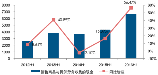 2016H1 上市公司銷售商品與提供勞務收到的現金同比增長 51.40%