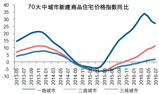 2016H1 各線城市住宅價格指數同比分別增長為 29%、10%、1%