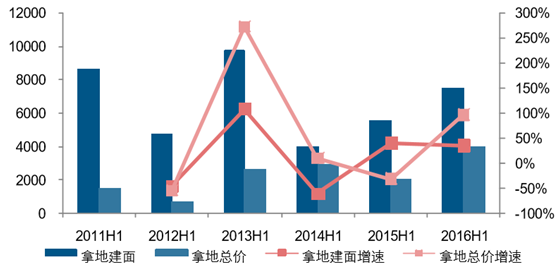 2016H1 上市房企拿地總價同比增長 97.51%,拿地規劃建面同增 35.56%(億元,萬平)