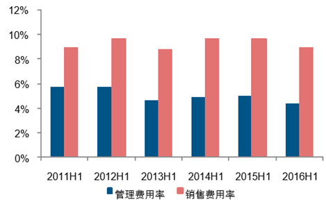 2016H1 管理費用率下降 0.68pct,銷售費用率降低 0.70pct