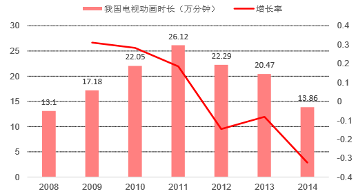 2014 年我國超過 90%以上的 TV 動畫是針對低幼兒童的益智 教育和親子類節目。雖然偶爾有熊出沒、喜洋洋等佳作出現但是整體而言電視動畫質量不高。并且在電視臺壟 斷發行渠道的體系下,動畫播出空間有限,相比于受眾面更廣的成年人節目,低幼動畫并不受到電視臺的歡迎。 在政府補貼下,電視動畫時長曾不斷增加,但是供過于求的背景導致行業盈利狀況不斷惡化,從 2011 年開始我 國電視動畫時長快速下滑,2014 年播出時長僅為 2011 年的一半左右。
