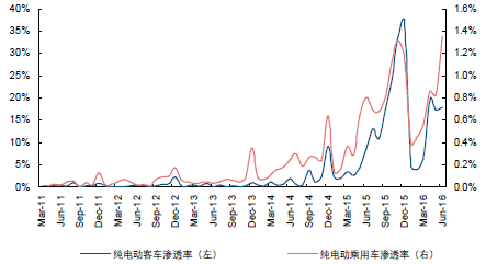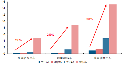 核心提示:新能源客車、乘用車、專用車增速快,市場全面開花:從市場總體情況看,自2014 年開始新能源汽車產銷量呈現爆發式增長以來,2015 年新能源汽車產銷量分別達34.05 及33.11 萬臺,分別同比增長333.73%及342.86%,2016新能源客車、乘用車、專用車增速快,市場全面開花:從市場總體情況看,自2014 年開始新能源汽車產銷量呈現爆發式增長以來,2015 年新能源汽車產銷量分別達34.05 及33.11 萬臺,分別同比增長333.73%及342.86%,2016 年上半年行業仍舊延續較好增長態勢,上半年產銷量增速分別達129.3%及118.7%的較高水平;從各類型汽車滲透率角度看,客車基數較少且得益于公交系統中政府大力支持,因此普及最早、滲透率最高,乘用車及專用車基數大、消費行為更加市場化,普及稍晚、滲透率低,相對而言空間也更大。