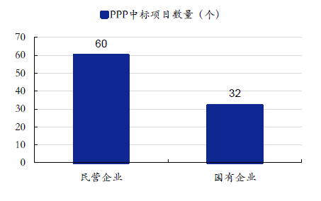民營企業相較國企中標數量多,總投資額較小。根據我們統計,上市建筑企業中民營企業公告中標PPP 項目60 個,國有企業為32 個;中標金額方面,民營企業合計中標金額978億元,國有企業則為2050 億元。單體項目中標金額 ,國有企業為64 億元,顯著高于民企的16 億元。
