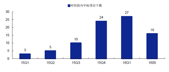 PPP 項目中標節奏顯著加快。自去年第三季度起,建筑上市公司公告中標PPP 項目數量呈現逐季遞增態勢,今年上半年累計公告中標項目43 個,已超去年全年公告數。