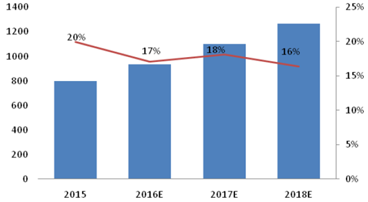 中國醫藥制造業固定資產投資平穩增長,潔凈行業集中度低。雖然市場發展較為迅速,但目前制藥潔凈設備市場處于極度分散的狀態。截至13年底,單一廠商對于某一業務的市場份額不及10%。根據中國電子學會對2016-2018 年中國潔凈室工程行業市場規模預測,整體潔凈行業將在2017年達到千億水平的市場規模,醫療潔凈的市場空間也將隨大勢增長。