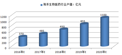 “十二五”期間海洋生物醫藥行業發展速度相較“十一五”有了明顯提升,“十三五”期間國家對海洋經濟的投入力度相對“十二五”會有所提高,醫藥企業及社會資本對海洋生物醫藥這個新興行業的關注度提升,行業發展環境也在不斷改善,預測“十三五”期間,中國海洋生物醫藥行業五年復合增速將在25%-30%區間內,以中間值27.5%估算,2020年中國海洋生物醫藥行業產值可達1100億元。