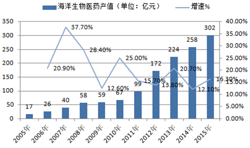 在過去的十幾年里,中國海洋生物醫藥取得了長足發展,行業增加值由2005年17億元增長至2015年的302億元,增長了十幾倍,2005-2015年間行業復合增速接近30%,而整個海洋產業產值復合增速不足13%,海洋生物醫藥儼然已成海洋經濟最亮眼的發展領域。