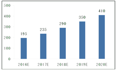 近幾年中國采漿量年平均增速在10%左右,以這個速度來看,未來五年內(nèi)行業(yè)供血缺口將一直存在,這是血液制品行業(yè)未來得以快速發(fā)展的根本動力所在,在量加齊升的背景下,行業(yè)將加速前行。預測未來五年中國血液制品行業(yè)增速將在20%左右,2020年市場規(guī)模有望突破400億元。2016-2020年市場規(guī)模(單位;億元)