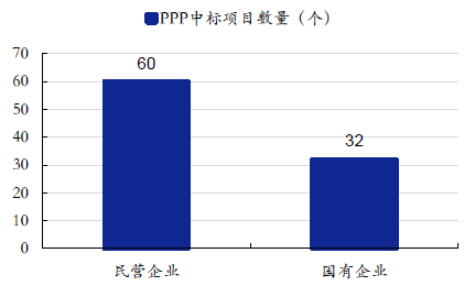 民營企業相較國企中標數量多,總投資額較小。根據我們統計,上市建筑企業中民營企業公告中標PPP 項目60 個,國有企業為32 個;中標金額方面,民營企業合計中標金額978億元,國有企業則為2050 億元。單體項目中標金額 ,國有企業為64 億元,顯著高于民企的16 億元。