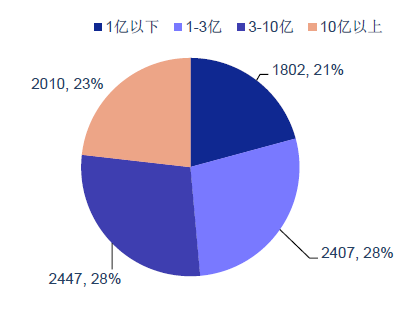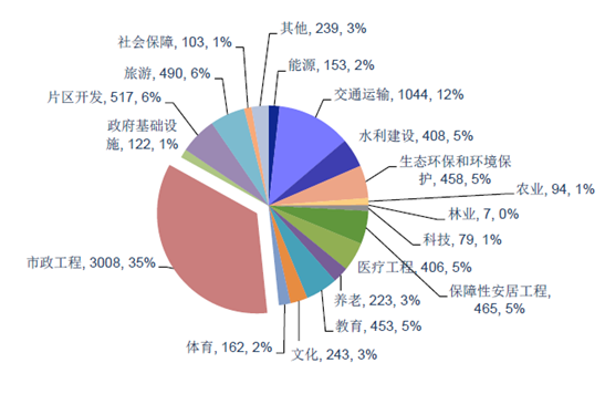 項目按規模劃分。1 億以下、1-3 億、3-10 億、10 億以上項目分別為1802/2407/2447/2010個,占比分別為20.77%、27.75%、28.21%、23.17%。其中0-3 億項目數前三分別是市政工程、教育及交通運輸,分別為1846/282/275 個,占總數的57.11%;3 億以上項目數前三分別是市政工程、交通運輸、園區開發,分別為1112/706/365 個,占總數的51.24%。
