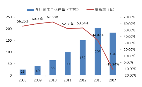 我國食用菌總體市場穩步增長,且規模巨大。盡管受到宏觀經濟下行的影響,食用菌總體規模增速下降,2014年我國食用菌產量達到3270萬噸。其中,杏鮑菇作為食用菌細分行業,行業發展勢頭強勁,雖不及香菇、平菇、金針菇等產量基數大,但杏鮑菇產量增速保持在較高的水平,2008年至2014年年增長率達到了27.59%。