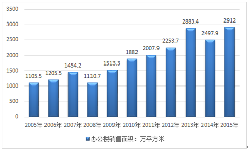 2014年我國辦公樓銷售面積達到2497.87萬平方米,較上年同期下降13.4%; 2015年我國辦公樓銷售面積達到2912萬平方米。