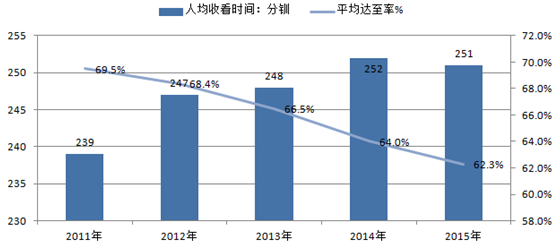 2011-2015年中國電視觀眾規模及人均觀看時長