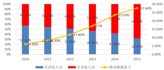 2010-2015 年運營商語音及非語音業務收入占比