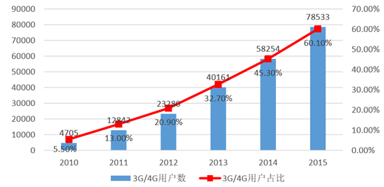 2010-2015 3G/4G 用戶數量及占比