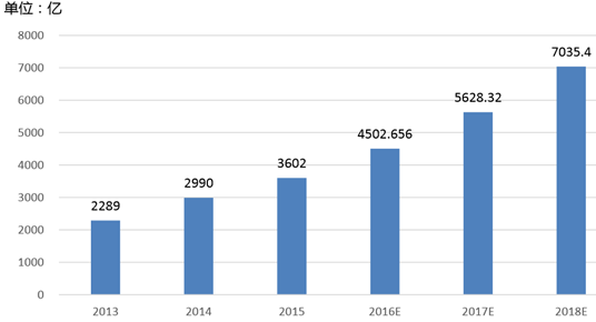 根據三大運營商公布的數據,移動互聯網業務收入從 2013 年 2289 億元上漲至 2015 年 3602 億元,累計上漲 57.3%,CAGR 達 25.4%,增速明顯。2014 年是中國的 4G 元年,根據國外經驗,4G 服務的推廣將促使 DOU 快速上揚。預計未來幾年將維持目前流量收入的高速上漲趨勢,預計到2018年達到7000億的市場規模。