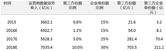 根據三大運營商公布的數據,移動互聯網業務收入從 2013 年 2289 億元上漲至 2015年3602億元,累計上漲57.3%,CAGR達25.4%。其中第三方流量經營在2015 年約有21.6億市場規模,占到整個流量市場的0.6%。隨著流量經營服務逐漸趨于綜合與個性化,第三方流量經營的份額也會相應提升,預計在2018年達到10%, 市場規模接近千億。第三方企業級流量經營的份額將由目前約15%提升至2018年30%, 結合工信部預測運營商到 2018 年數據業務收入達到 7035.4 億元的規模,對應第三方企業級流量經營的市場規模將達到211.1億, 3年增長30倍,空間巨大。