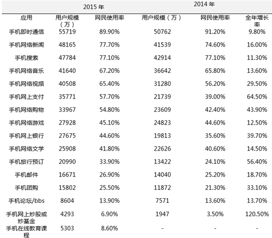2014-2015 年中國網民各類互聯網應用的使率