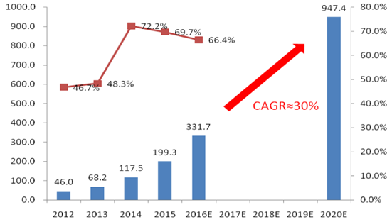 隨著智能終端的普及和移動互聯網的快速發展,SAAS 市場獲得高速發展的機會。 SAAS市場包含消費級SAAS(To C)和企業級SAAS(To B)。近年來,To C用戶市 場雖然仍占主流,但已呈現日漸飽和的狀態,但To B企業級市場份額仍處于高速增長的過程。據數據顯示,2015 年國內企業級 SaaS 市場規模將達到 199.3 億元人民幣,增長率高達69.7%,在企業高效運營管理需求、移動互聯網應用條件不斷成熟等多方因素推動下,市場規模仍將保持快速增長,預計2016年市場規模將超過331億元人 民幣,2015-2020 年復合增長率達到 30%,至 2020 年市場規模達到千億級別。企業級的市場通過云的服務,可以讓企業服務應用范圍更廣,基于SaaS的云計算市場和提供平臺服務的行業都將迎來業績的快速增長。