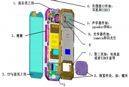 三防機對外觀要求不高,因此外殼多采用軟+硬的雙料注塑工藝。為達到抗跌效果,手 機邊緣多為軟膠設計。在機身防護上面,首先考慮機殼上面潛在的進水點,如前后殼、 側鍵、觸摸屏與前殼之間、耳機和 USB 口、聲學器件、光學器件、電池蓋、鎖緊件等。 前后殼殼體硬膠多采用通常采用 PC+20% 玻纖材料,代表產品是三星 CF3200HF F17003, CF3200HF K2115;殼體軟膠通常采用 TPU 材料,拜耳 TPU 80AP10,材 料硬度 80;硅膠密封圈材料通常采用信越 KE-931-UU,材料硬度 30;固定螺絲通常 采用經耐腐蝕處理的碳鋼螺絲,常用的耐腐蝕處理有電泳黑,鍍鋅鎳合金及 PVD 工藝。