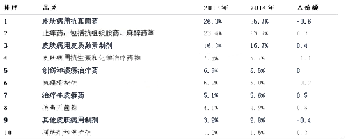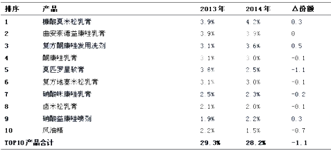 2013和2014年,我國皮膚病用藥市場中TOP10通用名銷售額份額分別為31.3%和30.5%,總體水平略有下降。其中,復(fù)方酮康唑、糠酸莫米松和曲安奈德益康唑增速較為明顯。