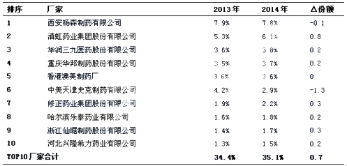 2013年和2014年,我國皮膚病用藥前十大廠家銷售額份額分別為34.4%和35.1%,總體水平略有增加。從增長情況來看,滇紅藥業(yè)集團(tuán)股份有限公司增長最為明顯,而中美天津史克制藥有限公司降幅最大。