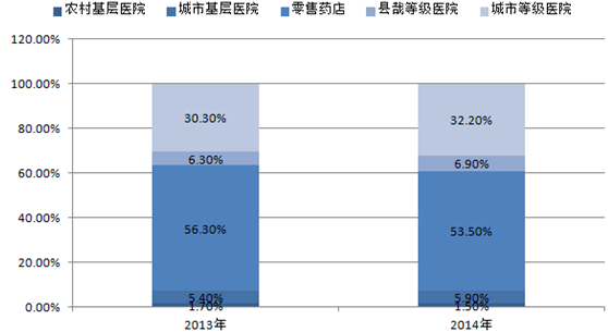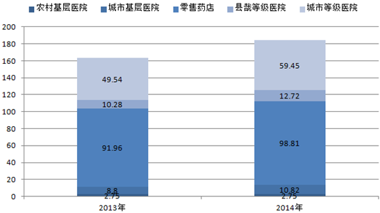 與其他藥品不同,盡管城市等級醫(yī)院是我國醫(yī)藥行業(yè)各大終端中的第一大終端,但皮膚病用藥規(guī)模僅占整個(gè)市場的30%左右,規(guī)模最大的是零售藥店市場。2013年和2014年零售藥店市場皮膚病用藥的銷售額分別為91.96億元和98.81億元,分別占整個(gè)市場規(guī)模的56.3%和53.5%,占比略有下降。而縣域等級醫(yī)院、城市基層醫(yī)院和農(nóng)村基層醫(yī)院的總體占比尚不足兩成。