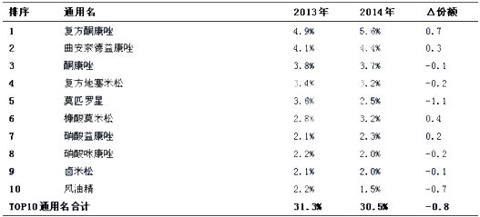 2013—2014年皮膚病用藥TOP10通用名銷售額份額