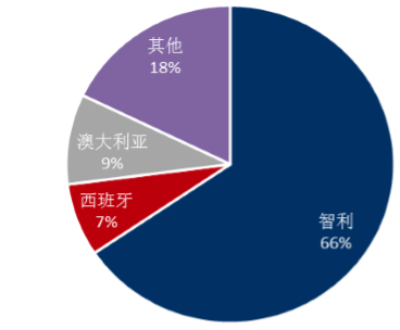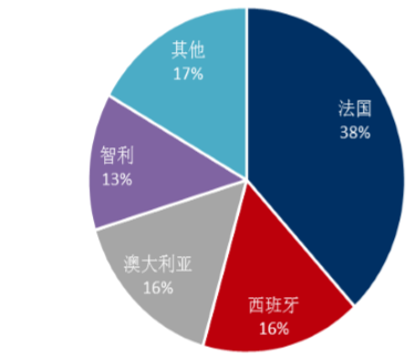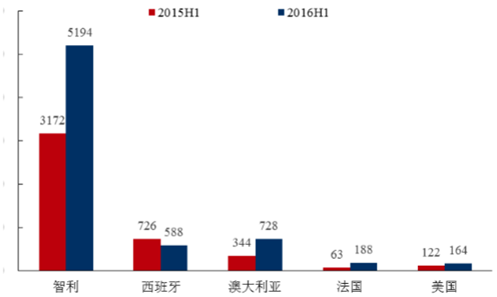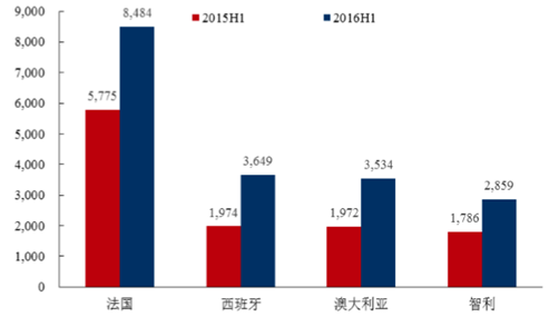 2016 年上半年, 散裝酒進口量 7.9 萬千升,維持 31.1%的高速增長,均價則從 15 年的 0.68 美 元/升略下降至 0.65 美元/升。散裝酒主要進口來源國中,智利占比達 65.5%。 智利在 2015 年初實施零關稅的影響持續,2016H1 國內進口智利散裝葡萄酒量達 5194 萬升,同比大增 64%,均價 0.58 美元/升。而相較西班牙低價葡萄 酒,澳大利亞、美國和法國均價在 1 美元/升以上的葡萄酒進口量增長較快。