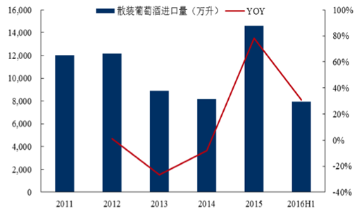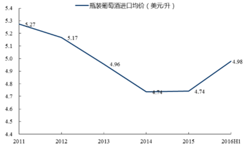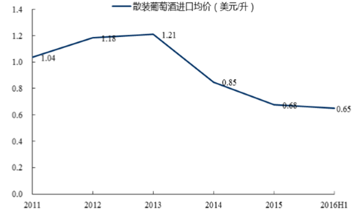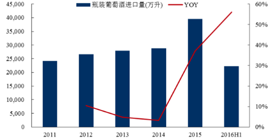 核心提示:2016 上半年,葡萄酒進口量為 31.2 萬千 升,同比+20.5%;進口額為 14.5 億美元,同比+18.2%;平均價格為 4.64 美元/ 升,同比下降 1.9%。進口酒市場份額以進口量計算為達到 37.8%,較去年同期提 升 3p2016 上半年,葡萄酒進口量為 31.2 萬千 升,同比+20.5%;進口額為 14.5 億美元,同比+18.2%;平均價格為 4.64 美元/ 升,同比下降 1.9%。進口酒市場份額以進口量計算為達到 37.8%,較去年同期提 升 3pct 左右。