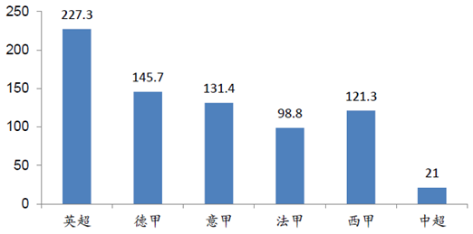 國外體育商業模式成熟,球員薪資高于國內球員。由于NBA 在2015 年簽下了9 年240 億美元的電視轉播合同,聯盟的工資帽也開始了瘋狂的增長。上賽季工資帽的總額只有7000 萬美元,奢侈稅的觸發線是8470 萬美元。而在2016 至2017賽季,工資帽已經變成了9400 萬美元,奢侈稅觸發線預計將超過1.1 億美元。NBA的人均年薪高達400 萬美元,而CBA 人均年薪只有40 萬人民幣。在職業足球行業也存在類似的情況,盡管近年來國內足球俱樂部加大了投入,中超球員的平均年薪為21 萬英鎊,但是和國外五大聯賽相比,薪資仍然較低。