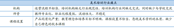 美術行業的核心痛點是產品同質化與運營流程不標準。絕大多數的少兒美術培訓機構的產品類型一致,創新能力較差,互相模仿;同時,許多小規模美術培訓機構私人經營,規模小,運營流程較不規范,難以做到課程完整性和系統性。其次,與大部分的素質教育培訓一樣,美術行業的問題還包括培訓機構專業化、規范化問題,教師和課程設置方面的問題。首先,培訓機構缺乏行業規范性,培訓機構行業間缺乏交流,同時缺少與學校交流。其次,多數美術培訓機構教育理念和培養目標不明確,課程設置不恰當,忽視美術學科的本質,缺少自己特色的校本課程。此外,教師專業化、職業化程度低,流動性大、不穩定等問題也影響美術培訓機構的長期穩定發展。