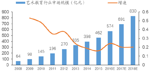 核心提示:藝術教育培訓市場規模不斷擴張,美術是藝術培訓行業主力軍之一,行業集中度逐步提升。我國藝術教育培訓市場規模從2008年的64億元不斷提升至2015年的462億元,年均復合增速32.62%,其中2015年較2014年同比增長了16%。預計,20藝術教育培訓市場規模不斷擴張,美術是藝術培訓行業主力軍之一,行業集中度逐步提升。我國藝術教育培訓市場規模從2008年的64億元不斷提升至2015年的462億元,年均復合增速32.62%,其中2015年較2014年同比增長了16%。預計,2018年整體藝術培訓市場規模將超過800億元。其中,音樂、美術和舞蹈培訓是其中最重要的三個組成部分。美術教育是藝術教育僅此于音樂教育最重要的部分,以2014年為例,美術培訓市場規模達到110億元,占到了中國藝術教育培訓行業規模的28%。