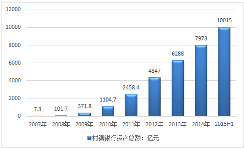 2007年我國村鎮銀行資產總額金額為7.3億元,隨著村鎮銀行數量的快速增長, 2014年我國村鎮銀行資產總額達到7973億元,2015年村鎮銀行資產總額為10015億元。
