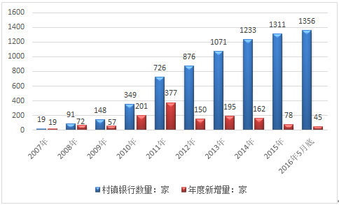 截至2014年底,全國已經組建村鎮銀行1233家,其中批準開業1152家。2015年我國已經組建村鎮銀行1311家,根據銀監會最新統計數據截止2016年5月底我國村鎮銀行總數達到1356家。