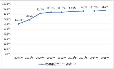 2007-2015年我國村鎮銀行資產負債率走勢圖