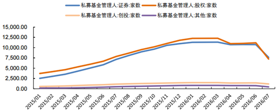 仍私募基金管理人數量上看,最近兩年基金管理人呈井噴之勢,仍 2015 年 1 月份的 6,974 家開始 持續增長,到 2016 年 3 月份達到峰值的 25,901 家,增長了 2.7 倍。隨著監管新規的出臺和空殼私 募的陸續清理,7 月份降到 16,467 家,但即便是這個數字也將近兩年前的 3 倍。