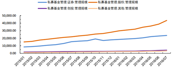 截至 2016 年 7 月底,基金業協會已登記私募基金管理人 16467 家,已備案私募基金 36829 只,認 繳規模 7.47 萬億元,實繳規模 6.11 萬億元,私募基金仍業人員 27.58 萬人。