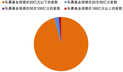 從規模構成上看,我國私募基金的規模普遍在 20 億元以下,雖然仍 4 月份以來數量有所下降,7 月 份數據為 15798 家,占比高達 96%,而規模在 50 億元以上的基金管理人家數不足 300 家,占比不 到 2%。