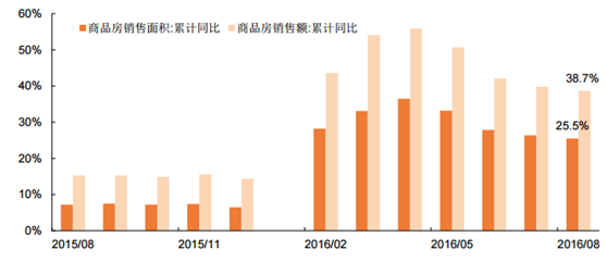 2016年1-8月全國商品房銷售面積 8.75 億平米,同比增長 25.5%