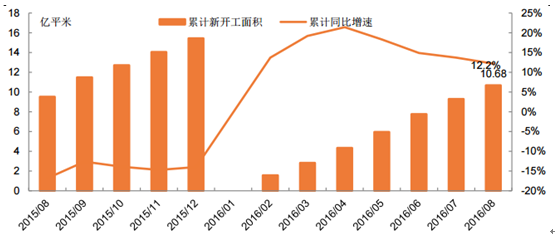 2016年1-8月房屋新開工同比增長12.2%