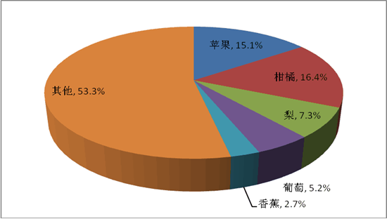 在主要大宗果品中,蘋果“十二五”期初種植面積214萬公頃,期末232.8萬公頃,增長8.8%;柑橘期初種植面積221.1萬公頃,期末251.3萬公頃,增長13.7%;梨期初種植面積106.3萬公頃,期末112.4萬公頃,增長5.7%;葡萄期初種植面積55.2萬公頃,期末79.9萬公頃,增長44.7%;香蕉期初種植面積35.7萬公頃,期末40.9萬公頃,增長14.6%。