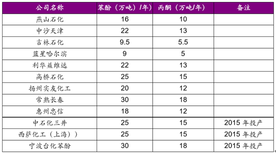 2015 年國內苯酚丙酮產能統計