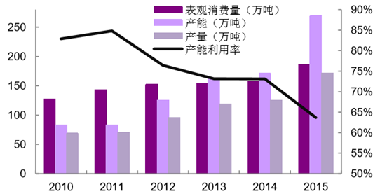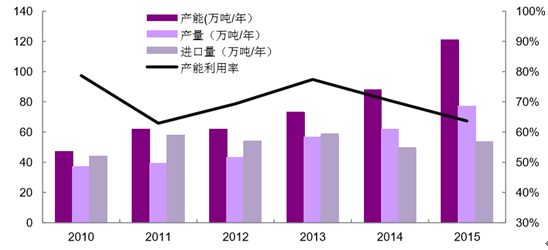 雙酚 A 是我國需求量增長較快的化工品之一,2014 國內表觀消費量為 111.5 萬噸,進口依存度達 44.5%,2015 年國內雙酚 A 裝置集中投產,產 能擴張 33 萬噸,2015 年中國雙酚 A 產能將達到 121 萬噸/年,較上一年 88 萬噸產能增幅達 37.5%。雙酚 A 行業產能趨于過剩,而且在進口產品的激烈 競爭下行業產能利用率下降至 64%。