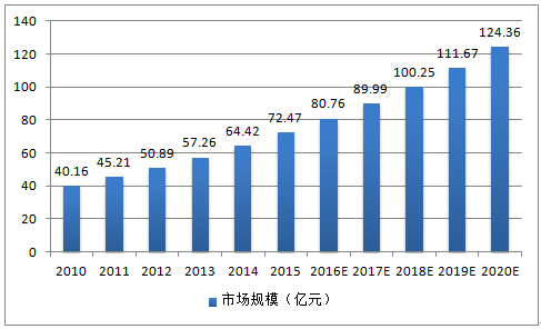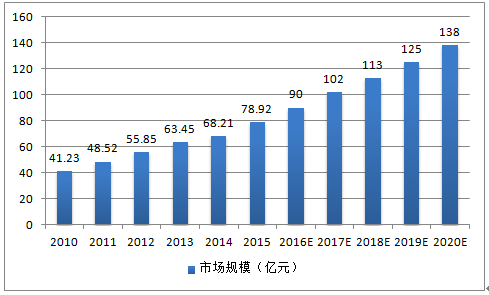 2010-2020 年中國光纖連接器市場規模(億元)