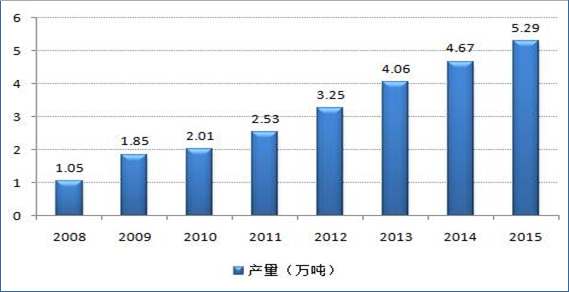 2014年我國(guó)石斛行業(yè)產(chǎn)量約4.67萬(wàn)噸,同比2013年的4.06萬(wàn)噸增長(zhǎng)了約15.02%,近幾年我國(guó)石斛行業(yè)產(chǎn)量情況如下圖所示: