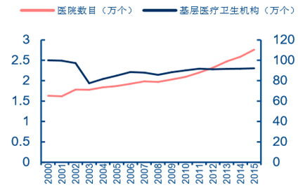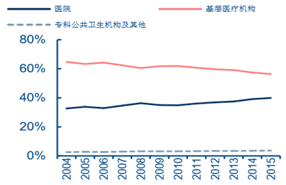 目前,我國醫療資源結構性失衡情況嚴重,我國 80%左右的醫療資源集中在大城市, 20%分布在基層和農村,造成我國基層醫療服務能力相對較弱,發展較為緩慢。從供給側看, 2000-2015 年,醫機數目從 1.63 萬個增長到 2.76 萬個,增長幅度為 69.1%,而同期我國基 層醫療衛生機構數卻從 100.00 萬個下降為 92.08 萬個,下降幅度為 7.9%;從需求角度看, 2004-2015 年,醫院的診療人次占所有醫療機構診療人次的比例從 32.7%增長為 40.0%,而 同期基層醫療機構診療人次占比卻從 64.7%下降到 56.4%,醫院對醫生、患者、醫療費用的 虹吸效應使得我國醫療資源結構性失衡的問題持續加劇。