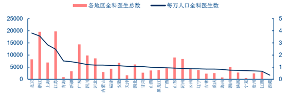 從各地的情況來看, 2014 年底北京、浙江、上海和江蘇四省每萬人口全科醫生數分別 為 3.82、3.57、2.85、2.48 人,已經率先完成了政策提出的 2020 年每萬人口全科醫生數目 達到 2-3 人的目標。