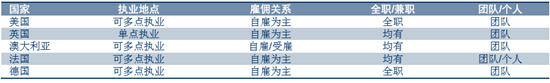 雇傭關系方面,國外全科醫生執業以自雇為主、受雇為輔;執業地點方面,以自由或多 點執業為主、單點固定執業為輔;服務方式則從個人服務向聯合團隊服務方向發展。服務團 隊主要由全科醫生、護士、接待員、健康服務助手、管理者等角色構成。